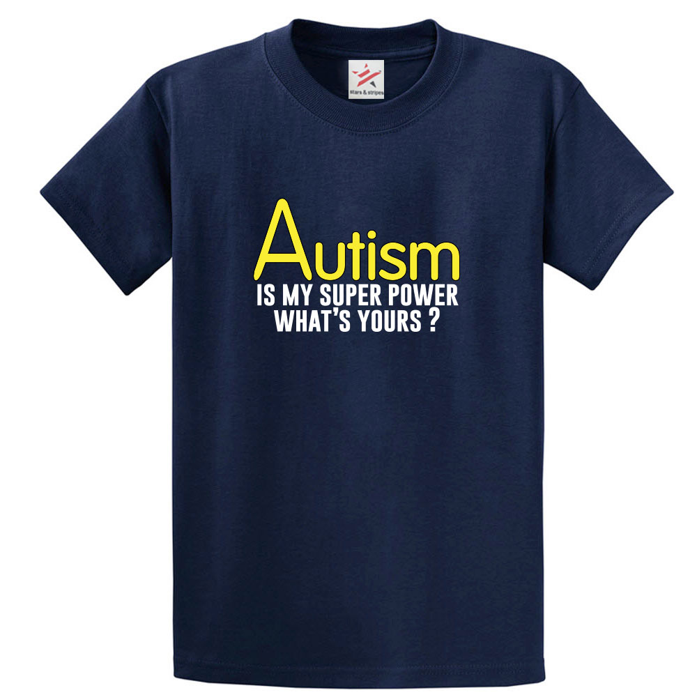 This is a brand new Autism Is My Super Power What's Yours? funny t-shirt and is printed with detailed print. It comes in a range of colour and sizes. All these soft cotton t-shirts have twin needle stitch detail on the neck, sleeves and hem. It makes ideal gift ideas for partner, boyfriends, friends birthday or festive gift.