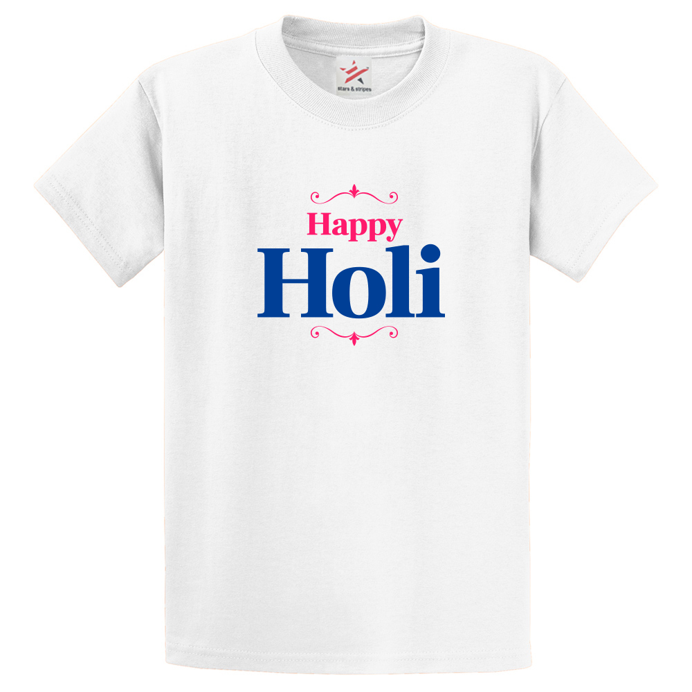 The "Happy Holi" T-shirt in white is a comfortable and breathable unisex crew neck T-shirt with a fun print that's perfect for celebrating the festival of colors in style. You can pair it with your favorite jeans, shorts, or skirts and get ready to immerse yourself in the joy and spirit of Holi. All these soft cotton t-shirts have twin needle stitch detail on the neck, sleeves and hem. It makes ideal gift ideas for partner, boyfriends, friends birthday or festive gift.