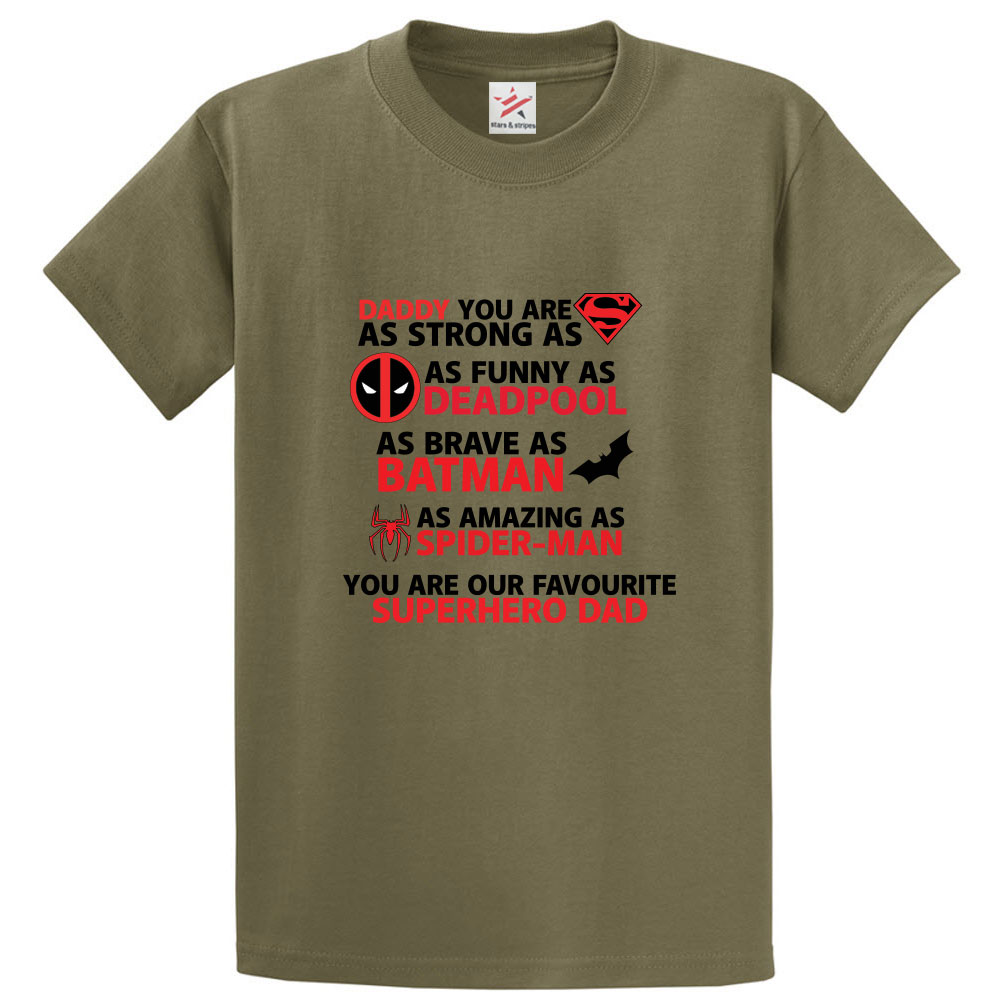 This is a brand new You Are Our Favourite SuperHero Dad funny t-shirt and is printed with detailed print. It comes in a range of colour and sizes. All these soft cotton t-shirts have twin needle stitch detail on the neck, sleeves and hem. It makes ideal gift ideas for partner, boyfriends, friends birthday or festive gift.