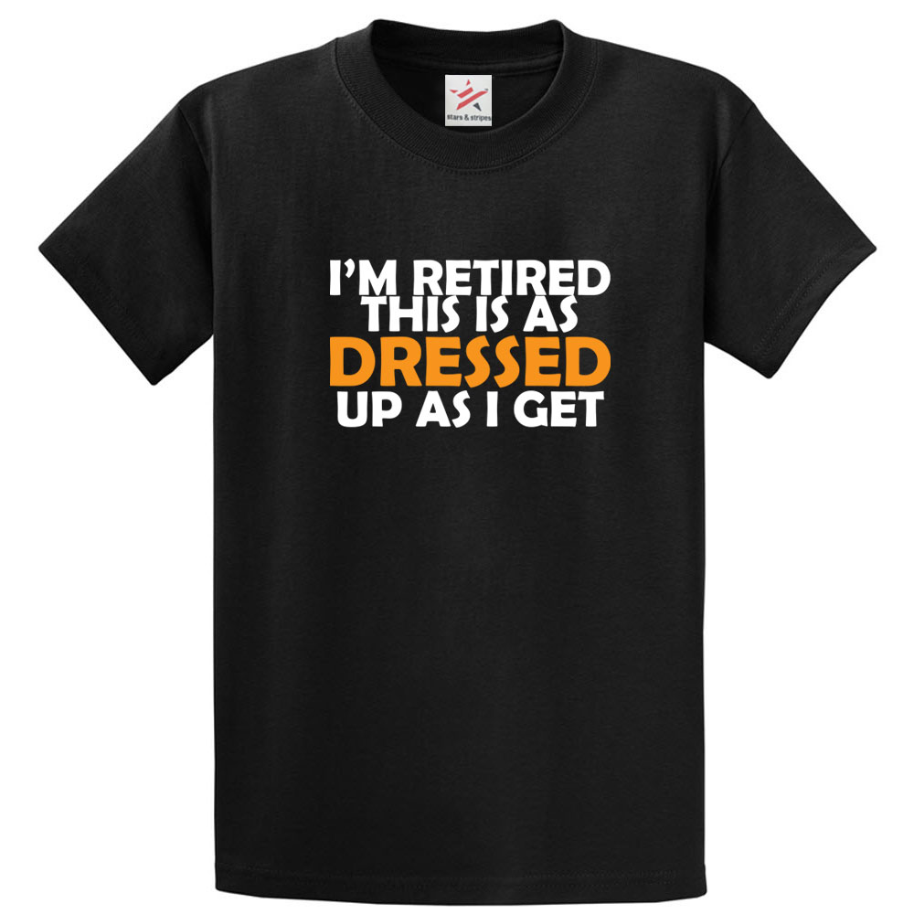 This is a brand new I'm Retired This Is As Dressed Up As I Get funny t-shirt and is printed with detailed print. It comes in a range of colour and sizes. All these soft cotton t-shirts have twin needle stitch detail on the neck, sleeves and hem. It makes ideal gift ideas for partner, boyfriends, friends birthday or festive gift.I'm Retired This Is As Dressed Up As I Get