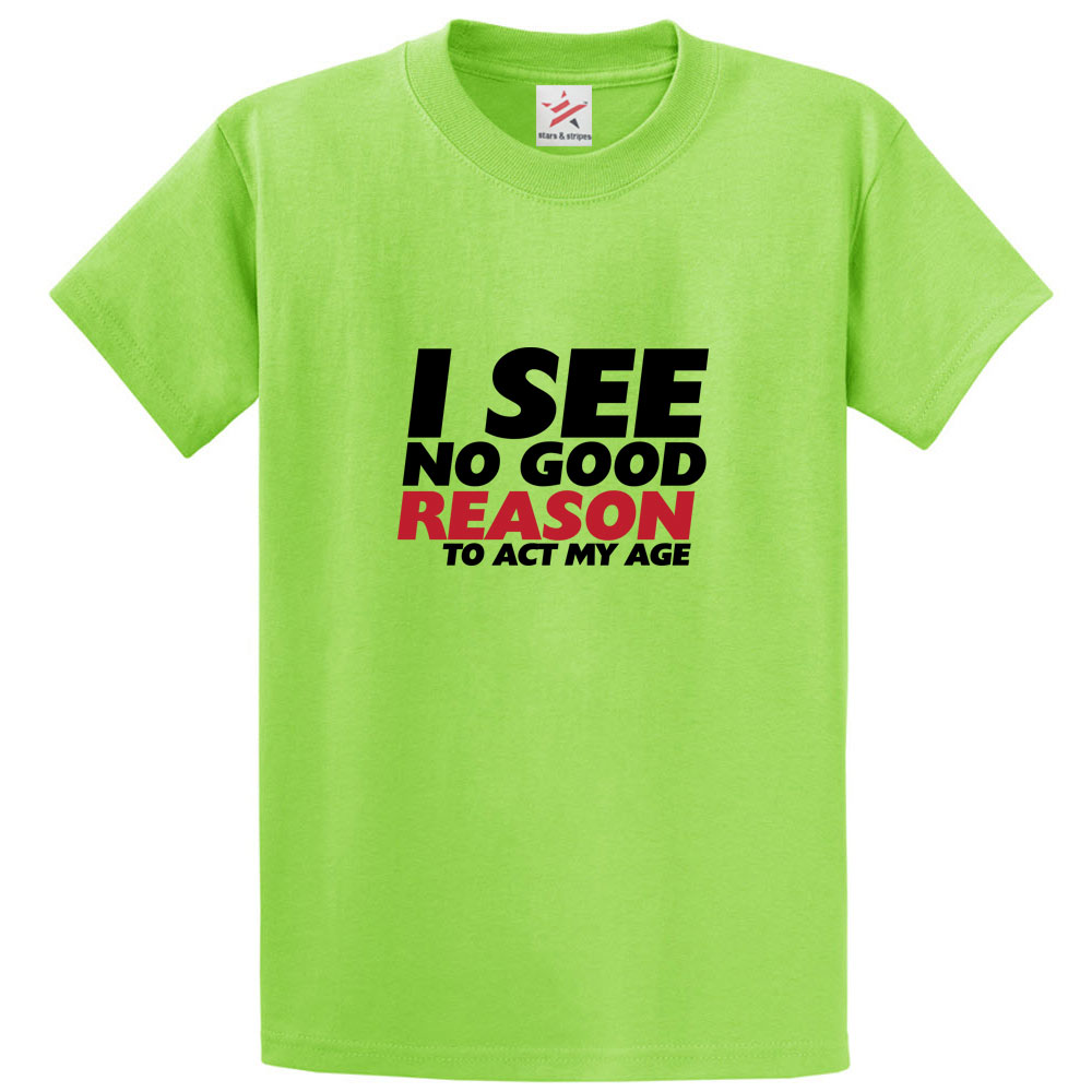 This is a brand new I See No Good Reason To Act My Age funny t-shirt and is printed with detailed print. It comes in a range of colour and sizes. All these soft cotton t-shirts have twin needle stitch detail on the neck, sleeves and hem. It makes ideal gift ideas for partner, boyfriends, friends birthday or festive gift.