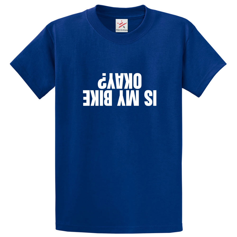 This is a brand new Is My Bike Okay Mirror Reflected Text funny t-shirt and is printed with detailed print. It comes in a range of colour and sizes. All these soft cotton t-shirts have twin needle stitch detail on the neck, sleeves and hem. It makes ideal gift ideas for partner, boyfriends, friends birthday or festive gift.