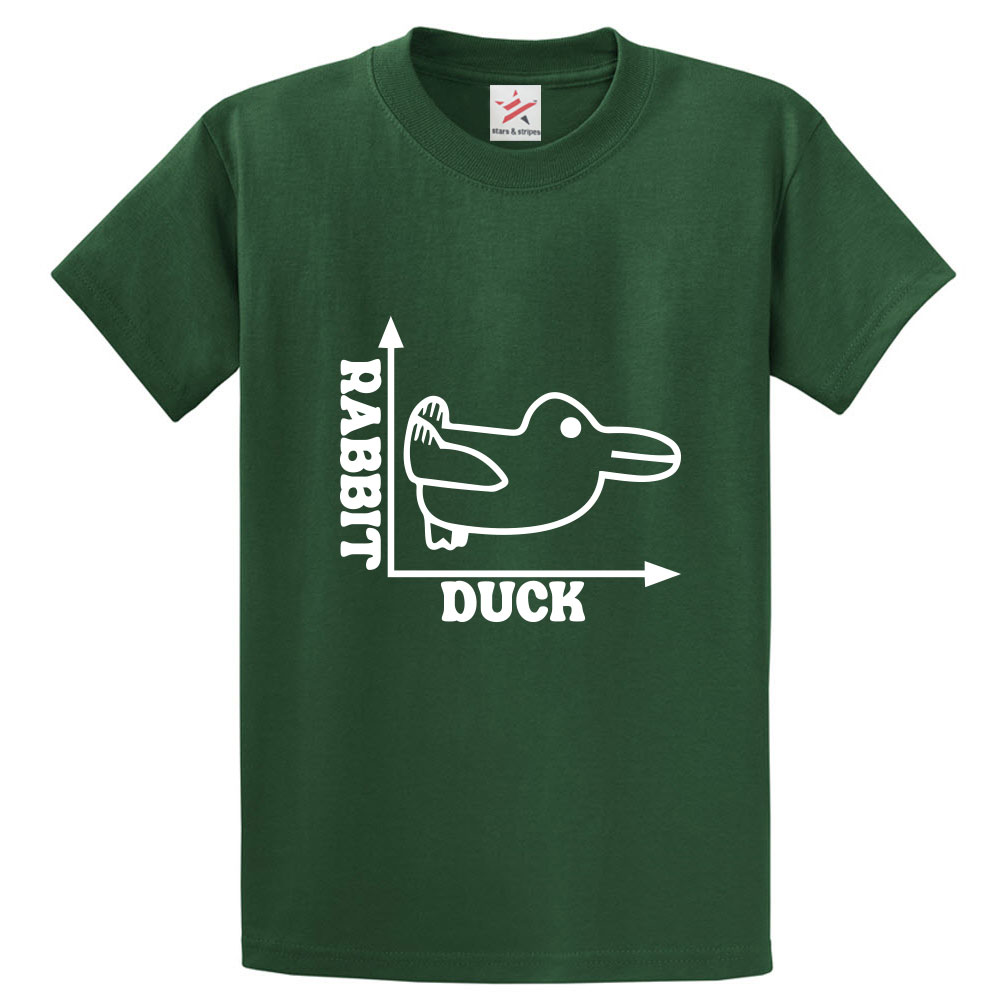 This is a brand new Rabbit Duck Illusion funny t-shirt and is printed with detailed print. It comes in a range of colour and sizes. All these soft cotton t-shirts have twin needle stitch detail on the neck, sleeves and hem. It makes ideal gift ideas for partner, boyfriends, friends birthday or festive gift.